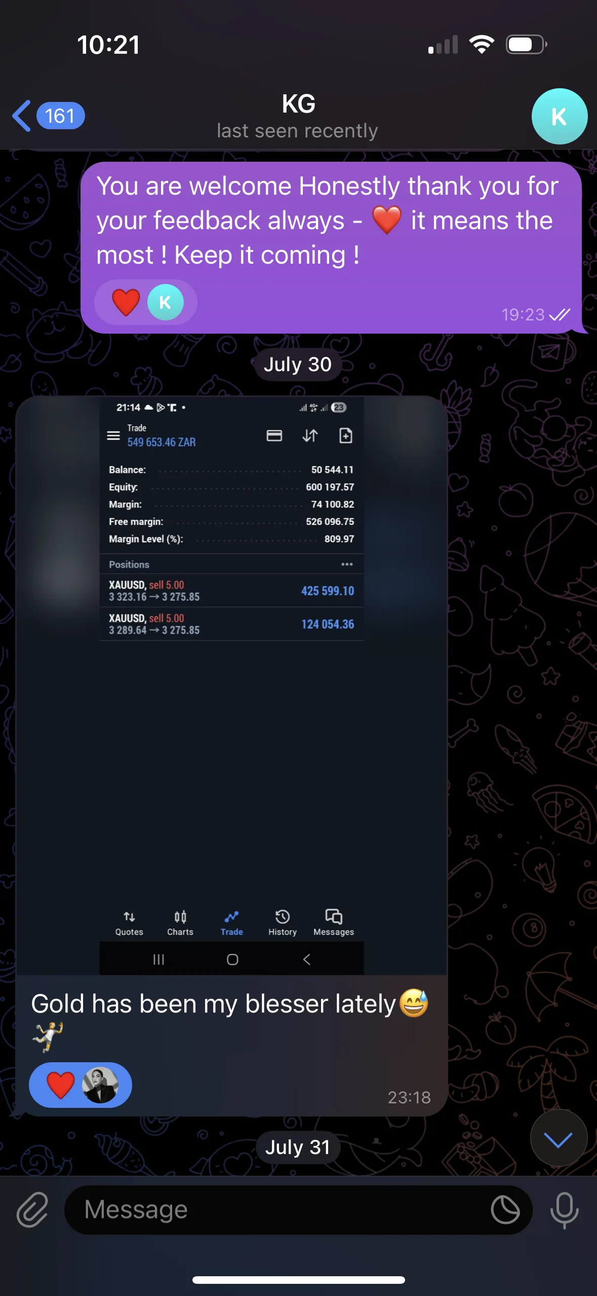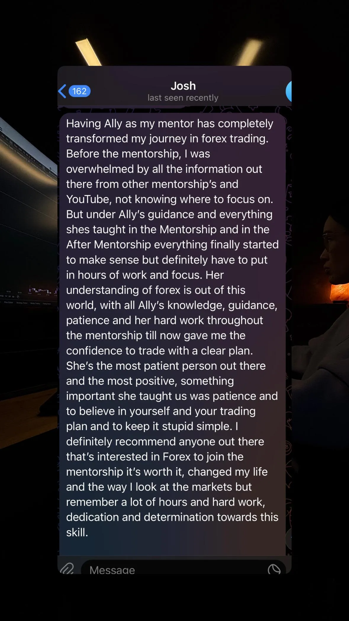 I thought I knew how to trade before Ally. I had my strategy and setups but it wasn't effective. I would only win 3 or 4 out of every 10 trades. I didn't really trust any other mentor I saw online--they all felt fake. The difference with Ally is that she actually cares. It took me just 2 months to double my account and in just 4 months, I'm up over 1000%. She is world class! - ZIYAAD