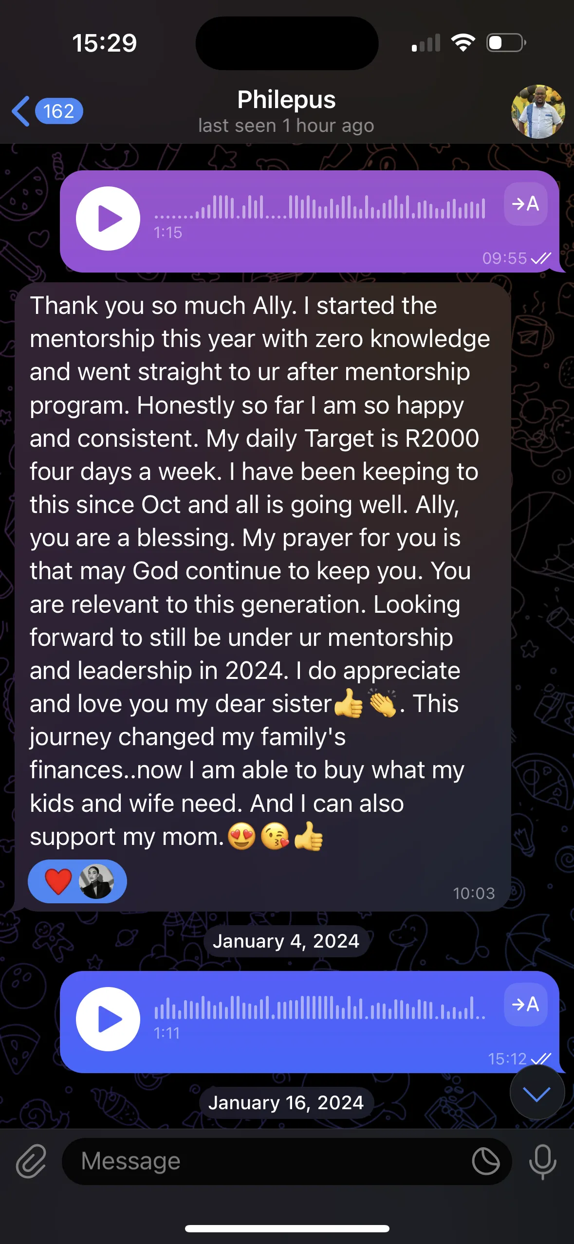 "I used to survive on one salary. Now, thanks to Elite Coaching, I earn the equivalent of two — one from work and one from trading. Elite Coaching didn’t just teach me trading — it rewired how I think, act, and show up for my goals. Ally doesn’t gatekeep. She pours everything into us like we’re family. Her belief in us made me believe in myself. If I had to choose again, I’d make the same decision. Elite Coaching changed my life. - PHILEPUS